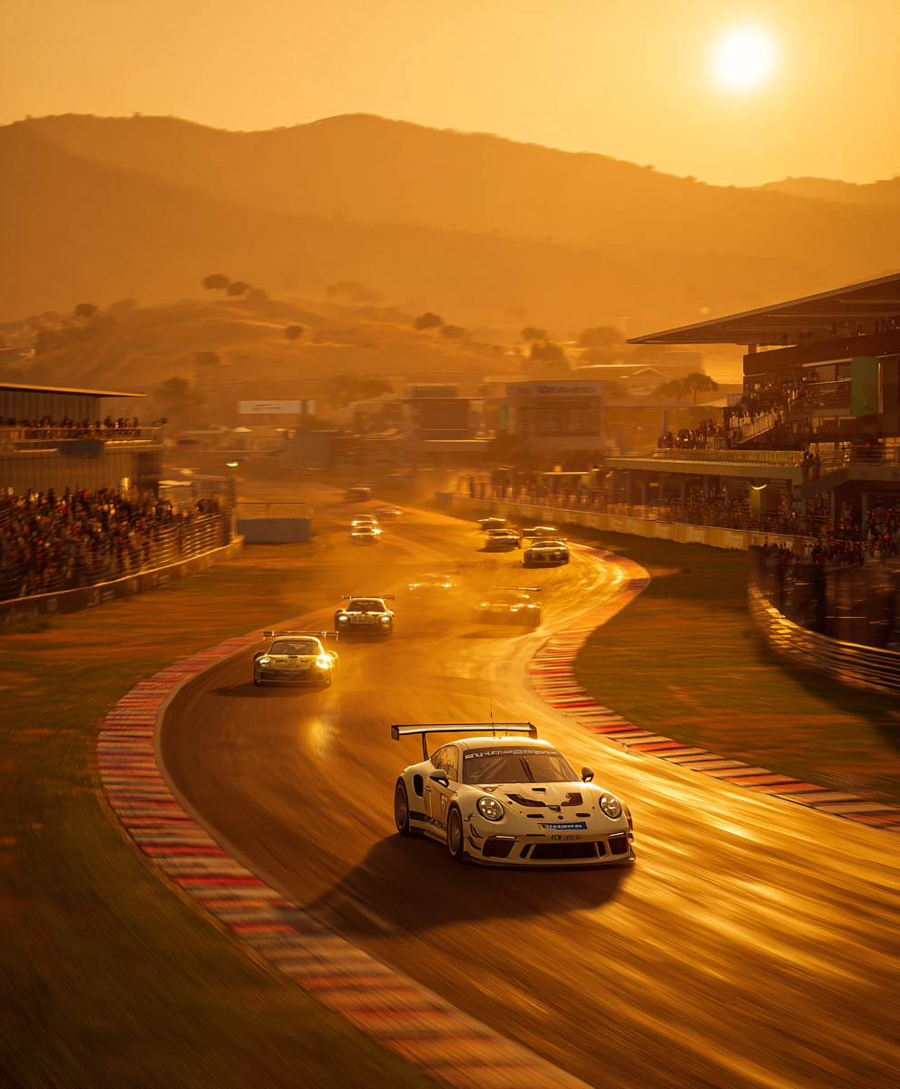The third race of the Porsche Cup Series takes place in South Africa, more precisely at Kyalami. The track is known for its fast final corner and the long start-finish straight. In the middle of a residential area, the Porsche 992 Cup cars make their rounds.