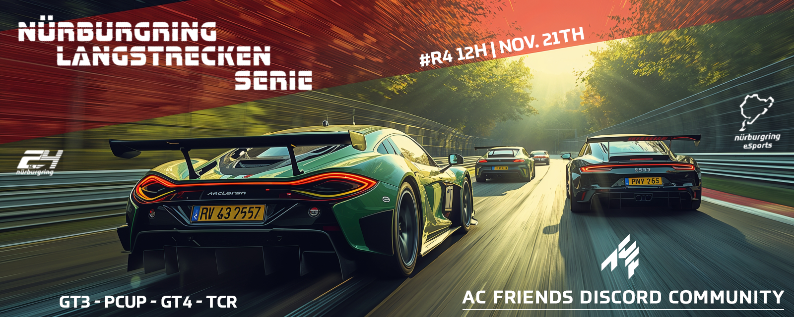 The final race of the NLS Nordschleife season, a collaboration between AC-Friends and Nürburgring eSports. The multi-class format, spanning 12 hours, will thrill every racing driver on the Nordschleife. Whether young or old, the Nordschleife is a familiar name to every motorsport enthusiast; everyone has a story to tell about this legendary track. From GT3 to TCR, every driver will push their car to its limits, striving to secure the final points and the championship title in their respective classes. With a 24-hour race, two 12-hour races, and the 6-hour sprint, a diverse and exciting first NLS season draws to a close. Close battles at the front and tight, split-second duels are once again guaranteed.