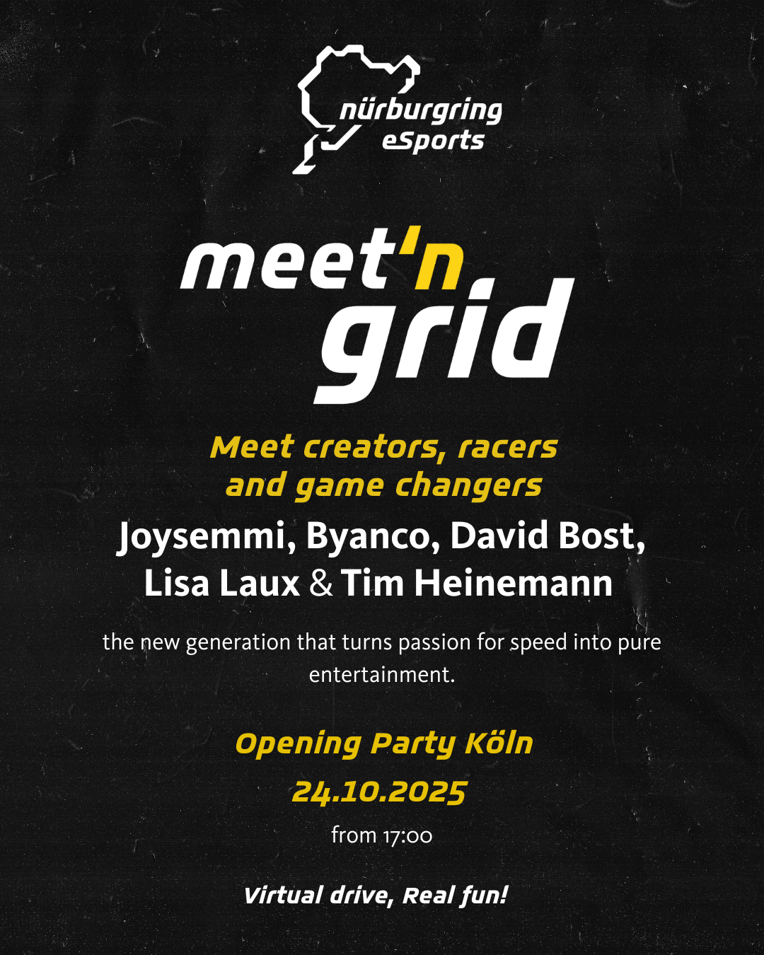 Venez rencontrer vos influenceurs, pilotes et sim racers préférés – Joysemmi, Byanco, David Bost, Lisa Laux et Tim Heinemann, – pour une soirée pleine d’émotions, de courses et de convivialité.